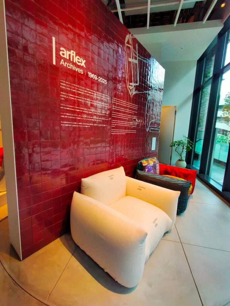 ナチュラルなモルタル床と白壁が心地よい空気をつくり、赤と白の“回転式の壁”が空間の印象を自由に変えてくれます。訪れるたびに新鮮で、思わず立ち寄りたくなるショールームです。- また、オープン記念として「arflex Archive展」も開催されています。