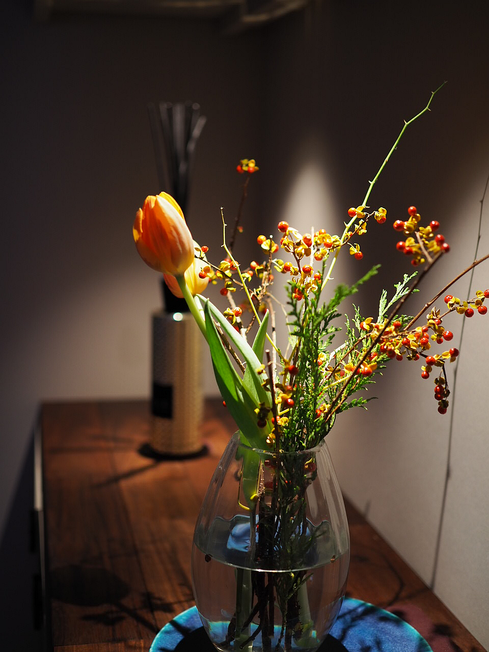 玄関に飾ったオレンジとイエローのチューリップが、