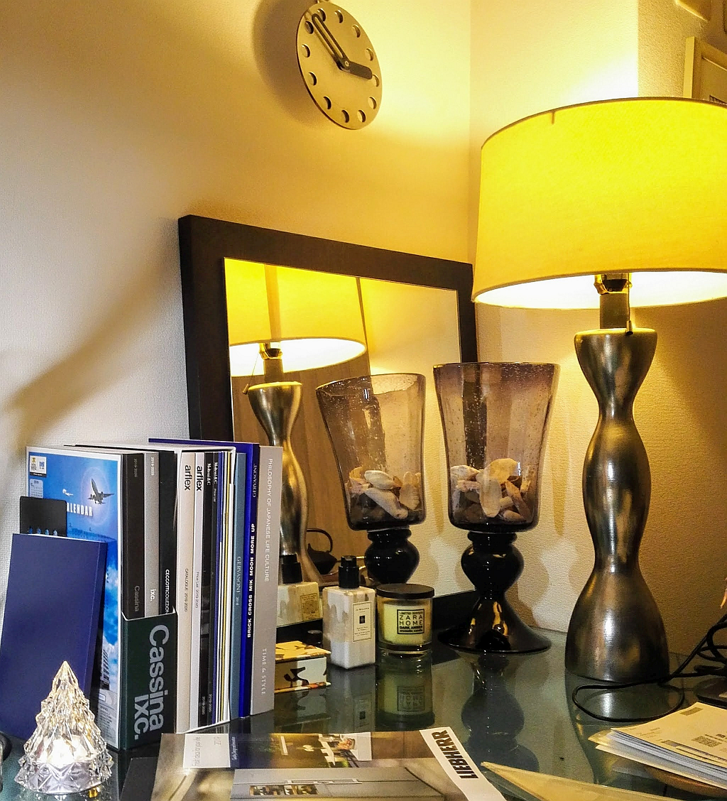 フロアランプの柔らかな光、テーブルの上のガラス越しの灯り、
