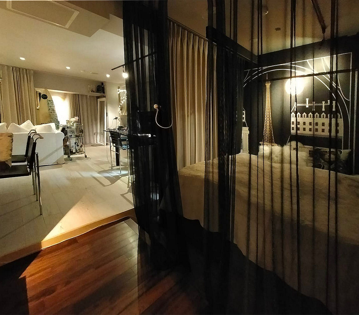 玄関の隣に設えたベッドスペースは、やわらかく仕切るカーテンと、